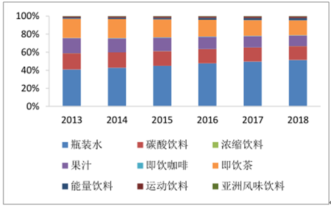 瓶装水在 13 年至 18 年间收入的 CAGR 为 11.5%,在软饮品类中位居第三,仅次于能量饮料和即饮咖啡。从消费习惯上看,以能量饮料和即饮咖啡为代表的功能性饮料增速亮眼,以补水解渴、补充能量为主要功能的瓶装水和运动饮料增速紧随其后,反映了消费者对功能性和健康化饮食的需求正逐渐增强。浓缩饮料、果汁、即饮茶和碳酸饮料的增速相对较慢则体现出消费者对于健康和低糖的诉求。相较于其他软饮品类,我们认为瓶装水的优点在于不含糖无发胖烦恼、选材天然添加剂较少、微量元素有利于健康以及解渴效果更好。从 13 年到 18 年,瓶装水在软饮消费结构中的占比由 40.8%逐年提升至 51.5%,平均每年提升约 2pct。消费者对于健康的追求有望带动瓶装水消费占比进一步提升,未来三年有望达到 55%左右。