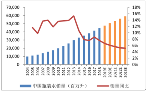 根据调查数据统计,2018 年我国瓶装水行业的收入规模为 1830.9 亿元,同比增长 9.5%,近五年 CAGR 为 11.5%;18 年瓶装水行业销量达到 446.4 亿升,同比增长 7.6%,近五年 CAGR 为 8.5%。此外,预测未来 5 年我国瓶装水行业销售额有望维持 7%-9%的增长,销量增速将保持在 6%-7%左右。