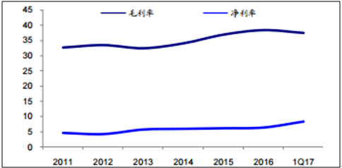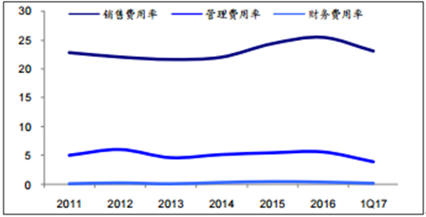 2016 年乳制品 7 家上市公司共实现收 916.0 亿元,同比增长 1.16%,增速同比下 降 4.34pct;实现归母净利润 57.7 亿元,同比增长 5.0%。2017 年一季度乳制品 7 家上 市公司共实现收 239.1 亿元,同比增长 5.26%,增速同比增加 3.54pct;实现归母净利 润 19.7 亿元,同比增长 10.7%。 2016 年乳制品 7 家上市公司毛利率为 38.26%,同比增加 1.50pct;1Q17 为 37.33%, 同比下降 4.26pct,主要由于行业促销激烈以及主要包材成本上涨。2016 年行业期间费 用率为 31.49%,同比增加 1.14pct,其中销售费用率 25.50%,同比增加 1.10pct;管理 费用率 5.57%,同比增加 0.15pct;财务费用率 0.42%,同比下降 0.11pct。2017 年一 季度费用大幅减少:行业期间费用率为 27.18%,同比下降 5.22pct,其中销售费用率 23.15%,同比下降 4.02pct,我们认为主要是由于季度间分配不均衡导致;管理费用率 3.88%,同比下降 1.05pct;财务费用率 0.16%,同比下降 0.16pct。
