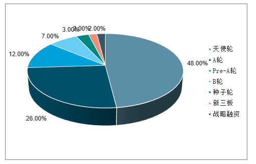 从投融资轮次分布来看,处于天使轮和A轮的融资数量最多,占比分别达到48%和26%。