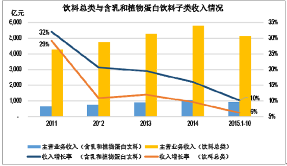 (3)随着饮料市场的发展,消费者的消费偏好也发生了深刻变化,随着大众对植物蛋白饮料偏好的增强,植物蛋白饮料行业获得了较快发展)随着饮料市场的发展,消费者的消费偏好也发生了深刻变化,随着大众对植物蛋白饮料偏好的增强,植物蛋白饮料行业获得了较快发展随着饮料市场的发展,消费者的消费偏好也逐渐发生变化,植物蛋白饮料由于具有营养、健康的特点而逐步为大众所接受和认同,市场需求结构、行业供给结构正在发生深刻变化,植物蛋白饮料行业在饮料行业中的地位显著提高。根据国家统计局的数据,2011—2015 年,含乳和植物蛋白饮料子类的企业收入仅占饮料总类企业收入的不到 20%,但占比逐年趋高,且收入增长率保持两位数,远高于饮料总类的收入增长率,具有较大的发展空间。