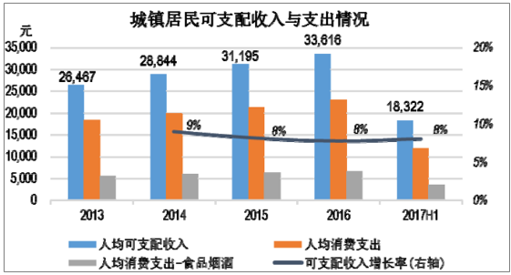 2016 年,城镇居民人均可支配收入达到 33,616 元,同比增长 8%。人均消费支出占可支配收入比例近四年来比较稳定,约为 70%。食品烟酒支出约占人均消费支出的三分之一。食品烟酒支出的增长率年均在 6%,与可支配收入增长率趋势较吻合,显示出稳定的增长趋势。