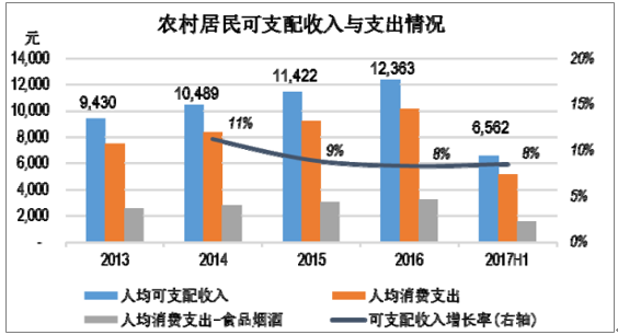 2016 年,农村居民人均可支配收入破万达到 12,363 元,同比增长 8%、。人均消费支出占可支配收入比例近四年来不断提高,由 2013 年的 79%小幅增至 2016年的 82%。食品烟酒支出约占人均消费支出的三分之一,食品烟酒支出随着总消费水平的增长而持续增高,显示出稳定的增长空间。