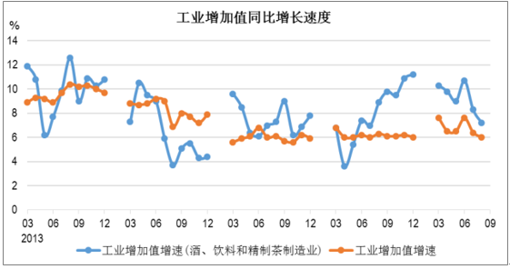 2013 年之后,随着宏观经济发展放缓,饮料行业增速有所下滑,但仍高于工业增加值增速。根据国家统计局的数据,报告期,全国工业增加值同比增速逐步下滑,目前稳定在 6%,其中酒、饮料和精制茶制造业的工业增加值平均同比增速高于工业增加值平均同比增速。