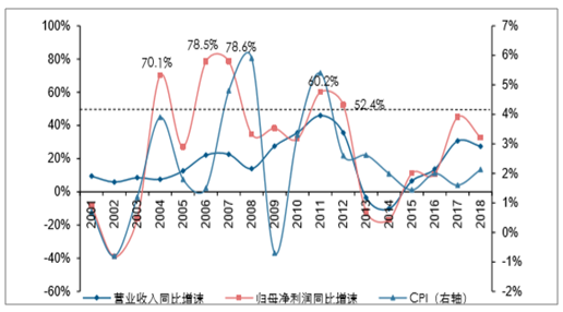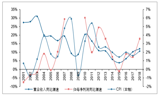 CPI 或强化白酒的价格周期,但是白酒价格周期更多是由其自身的周期决定。2003-2011 年白酒行业处于自身的景气周期,此期间白酒行业上市公司利润增速超过 50%的年份分 别是 2004、2006、2007、2011、2012 年,三次利润增速提速均是处于 CPI 抬升周期, CPI 或强化白酒的价格周期,CPI 向上过程中,白酒行业提价能力较强,利润弹性较大。 但是 2017 年 CPI 向下过程中,白酒行业利润增速依旧接近 50%,所以白酒行业的价格周期除了和 CPI 有一定相关性之外,更多的是由自身的周期决定。