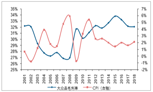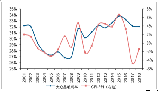 CPI 预期抬升,大众品提价底气更足,提价能力的强弱主要取决于竞争格局和定价权。 利润率长期由竞争格局决定,由于中短期大众品提价主要是成本驱动型,因此 CPI-PPI 影响大众品中短期毛利率。2016 年底至 2017 年 PPI 的高企,导致大众品毛利率承压, 2018 年大众品主要企业陆续完成提价,2019 年在提价红利以及部分成本如包材回落预 期下利润率有望提升。