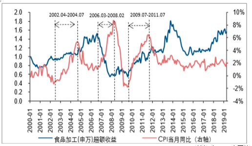 复盘了 2000 之后的三轮 CPI 提升过程中,食品饮料板块超额收益和 CPI 的关系:
