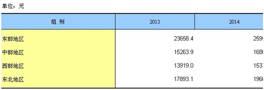 全国居民按东、中、西部及东北地区分组的人均可支配收入