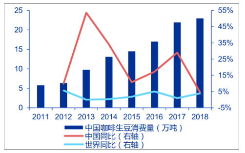 | 咖啡生豆消费 | 2008年中国为日本的4.56%,2018年中国为日本的46.35% | ||