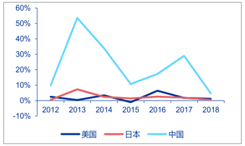 2012-2018年中美日咖啡生豆消耗量同比增长率对比