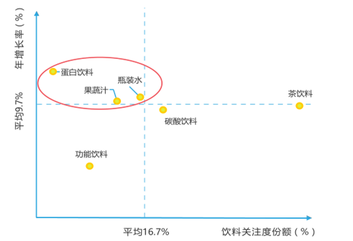 人们对瓶装水、果蔬汁以及蛋白饮料愈发重视,增速高于平均水平。
