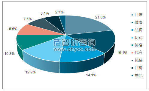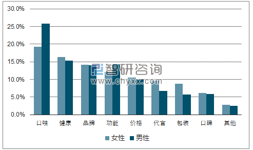 男性更注重口味,而在代言和包装方面,女性则占比较高。