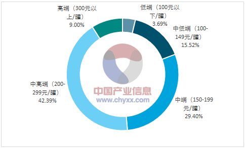 目前,国内婴幼儿奶粉市场价格引导主要看外资巨头,外资巨头价格调整周期一般为一年,定价策略侧重于毛利率目标法。如果原材料成本变化不大,则产品价格上调的可能性不大。因此,产品结构提升是价格提升的主要推动力。在近几年中高端(200-300元)及高端以上(300元以上)产品销售增长最为明显。目前,中国市场上高端(300元/罐以上)奶粉市场占有率达9%,中高端(200-299元/罐)奶粉市场占有率为42.39%,中端(150-199元/罐)奶粉市场占有率为29.40%。