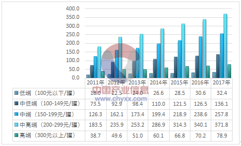 2011-2017年我国不同价位婴幼儿奶粉市场规模:亿元