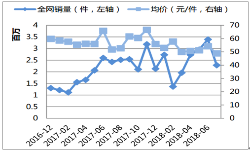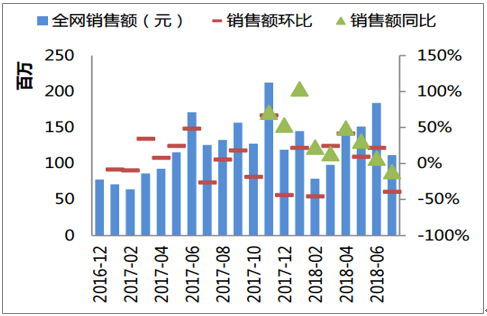 酸奶行业2018年1-7月销售额达9.08亿元,同比提升24.9%,其中销量增38.1%,均价减9.3%,实现量增价减,增速环比前六月下滑,略微呈现下滑态势。其中单7月1.12亿同减11.3%,销量同减5.8%,均价同减10.0%,环比6月增速下滑转负,受国内社会消费增速持续下滑等因素酸奶销售幅度下滑。天猫:淘宝销售占比约7:3,淘宝占比同比提升,行业品牌意识略有削弱。客单价100元以上占比维持6%小幅下滑,18年7月20-50元价格区间销售额略有收缩,50-100区间份额小幅上升,中高端化消费趋势开始占据主导。2018年7月酸奶销售额1.12亿,7月销售额较去年同期-11.3%,同比增速下滑转负;拆分量价来看,销售额下滑的驱动因素是量与价的下滑。7月全网销量同比-5.8%;均价同比-10.0%。