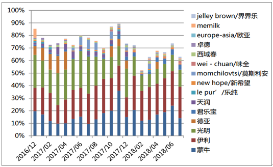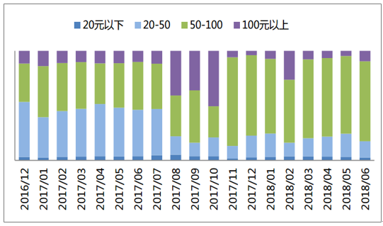 酸奶同样以整箱销售为主,2017年下半年,50元以上和50元以下销售额基本相当。18年7月20-50元价格区间销售额略有收缩,50-100区间份额小幅上升,中高端化消费趋势开始占据主导。