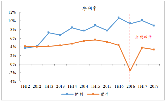 在行业竞争格局改善后,伊利、蒙牛开始不再进行价格战,2017 年伊利销售费用率同比下降 0.5pct 至 22.8%,蒙牛销售费用率同比下降 0.1pct 至 24.7%,其中广告及宣传费用下降 4.7%至 50.83 亿元。净利率开始企稳回 升。