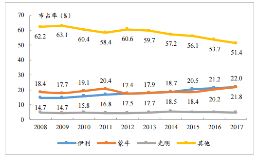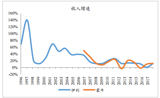 乳制品行业伊利和蒙牛两大龙头近年来在乳制品市场的市场占有率均提升, 行业集中度不断增加,龙头地位稳固。2017 年伊利股份市场份额 22%,蒙牛 乳业市场份额 21.8%。随着行业增长的趋缓,乳制品龙头收入增长也趋缓, 2005 年之前超过 40%的收入增长的情况不复存在。