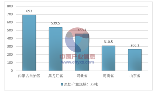 2017年我国原奶市场主要集中在内蒙古,黑龙江、湖北、河南、山东五省。其中内蒙古产量693万吨居首位,黑龙江539.5万吨,河北458.1万吨,河南310.5万吨,山东266.2万吨。