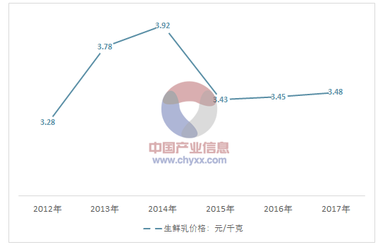 2012-2017年中国生鲜乳行业平均价格整体呈现上涨态势,从2012年的3.28元/千克增长到2017年的3.48元/千克,其中2014年的达到了3.92元/千克,达到峰值。
