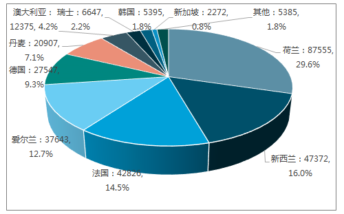 据统计,2017年我国共进口婴幼儿配方奶粉295932吨(税号19011010),同比增长33.7%,价值39.8亿美元,同比增长32.3%。主要来自荷兰87555吨,占29.6%,同比增长10.8%;新西兰47372吨,占16%,同比增长97.9%;法国42862吨,占14.5%,同比增长185.3%;爱尔兰37643吨,占12.7%,同比增长16.3%;德国27547吨,占9.3%,同比增长30.4%;这5个国家约占中国总进口的82.1%。12月我国共进口婴幼儿配方奶粉32533吨(税号19011010),同比增长22.3%,价值41569.04万美元,同比增长18.4%。主要来自荷兰7118吨,占21.9%,同比减少19.8%;新西兰4742吨,占14.6%,同比增长71.5%;法国6402吨,占19.7%,同比增长170.2%;爱尔兰3996吨,占12.3%,同比增长12.4%;德国2564吨,占7.9%,同比增长19.9%;这5个国家约占中国总进口的76.3%。