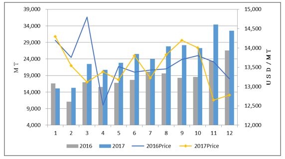 2016-2017年中国婴幼儿配方奶粉月度进口量及价格统计