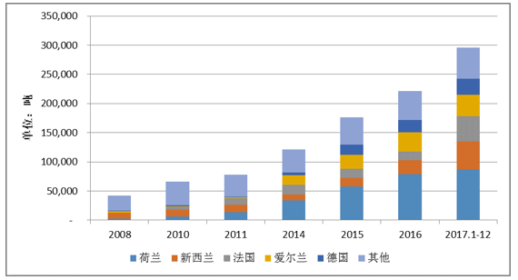 2008-2017中国婴幼儿配方奶粉进口量及来源国变化