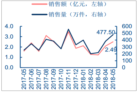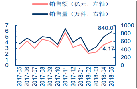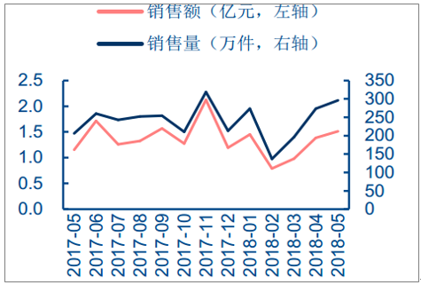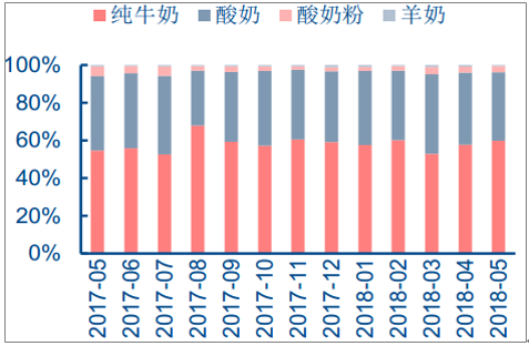 液奶/牛奶行业5月销售额同比增长 42.62%/55.89%,酸奶销售额同比增长31.18%。2018 年5月液奶行业阿里系线上消费同比继续上升,趋势向好,销售额达4.17亿,同比增长 42.62%。从细分品类的销售额来看,目前牛奶:酸奶:其他约为 60%:36%:4%,其中牛奶行业5月销售额为2.49亿,同比增长55.89%;酸奶行业销售额 1.51 亿,同比增长31.18%, 随着居民消费观念的持续升级,营养更高、口味更佳的酸奶占乳制品的消费比例稳定提升,2018年5月酸奶的消费比例已提升至36.35%。