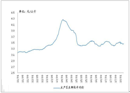 2011-2018年中国主产区生鲜乳平均价走势