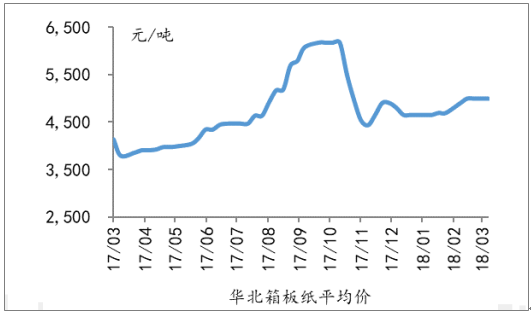 2017-2018年中国华北箱板纸平均价走势