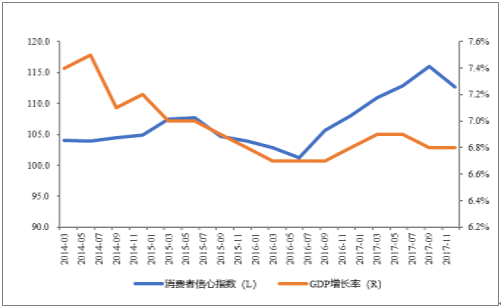 2014-2017年中国消费者信心指数及GDP增长率走势