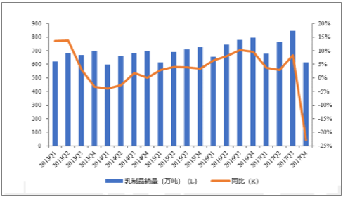 2013-2017Q4中国乳制品销量及同比增长走势