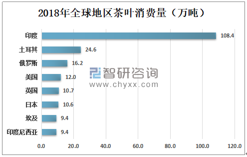 中国是世界上第一大茶叶消费国,2018年印度茶叶销售量排名全球第二,销量为108.4万吨;土耳其茶叶销售量排名全球第三,销量为24.6万吨;俄罗斯的茶叶销量为16.2万吨,排名全球第四。