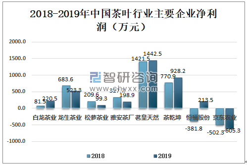 2019年八大企业中唯有京东农业企业净利润为负值;2019年京东农业净利润为605.3万元,其余企业白龙茶业、龙生茶业、松萝茶业、雅安茶厂、茗皇天然、茶乾坤、恒福股份净利润分别为220.5万元、523.3万元、99.3万元、198.9万元、1442.5万元、928.2万元、213.5万元。