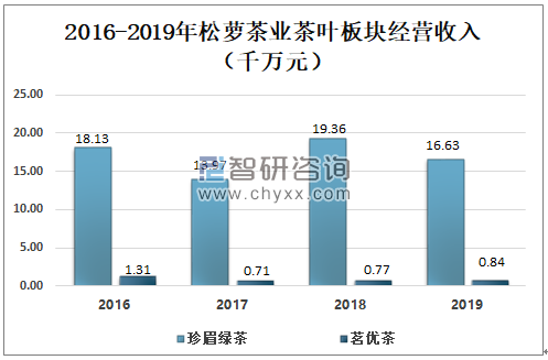 松萝茶业的主要茶叶经营板块主要分为珍眉绿茶、茗优茶;2019年松萝茶业珍眉绿茶板块收入为1.663亿元、茗优茶板块收入为0.084亿元。