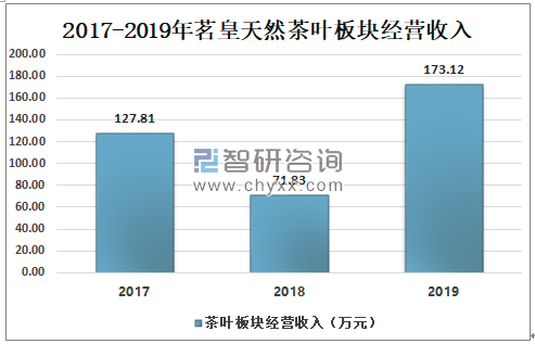 2017-2019年茗皇天然企业茶叶板块经营收入波动幅度较大,2018年茗皇天然企业茶叶板块经营收入为71.83万元,2019年茗皇天然企业茶叶板块经营收入为173.12万元。