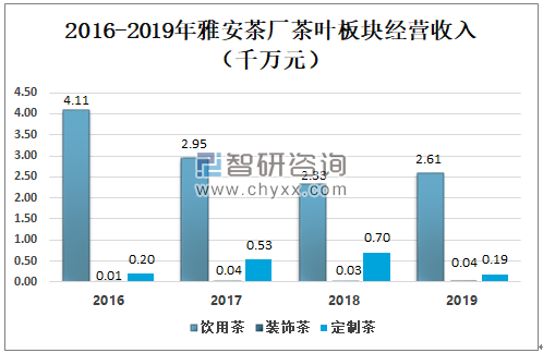 雅安茶厂茶叶板块主要分为饮用茶、装饰茶、定制茶;饮用茶板块为经营收入的主要来源,2019年饮用茶、装饰茶、定制茶经营收入分别为0.261亿元、0.004亿元、0.019亿元。
