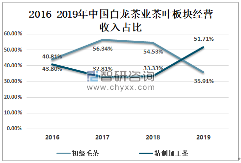 白龙茶业的经营收入主要分为初级毛茶、精制加工茶、其他业务收入。2019年白龙茶叶初级毛茶、精制加工茶板块经营收入分别为0.034亿元、0.049亿元,占比较大,占公司经营收入35.91%、51.71%。