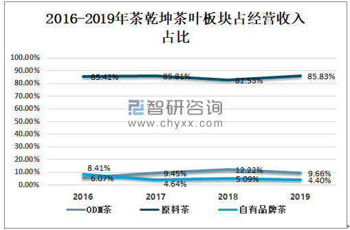 茶乾坤中OMD茶板块占经营收入占比较大,2019年OMD茶板块占比达85.83%;2019年茶乾坤原料茶、自有品牌茶分别占比9.66%、4.40%。