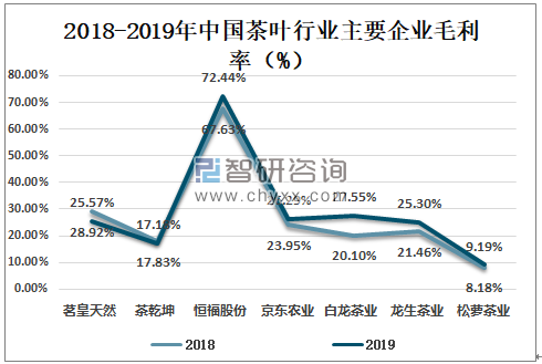 2018-2019年恒福股份毛利率在八大企业中排名第一,2019年茗皇天然、茶乾坤、恒福股份、京东农业、白龙茶业、龙生茶业、松萝茶业、雅安茶厂毛利率分别为28.92%、17.18%、72.44%、26.29%、27.55%、25.30%、9.19%。