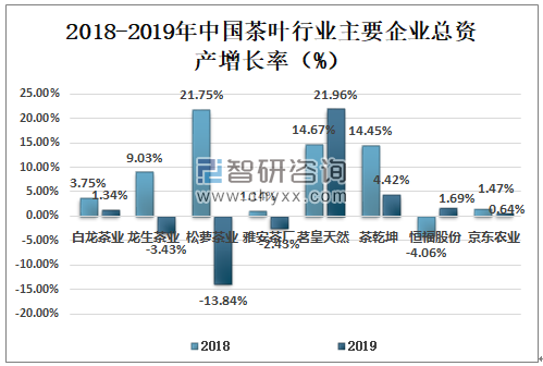 智研咨询发布的《2020-2026年中国茶叶行业竞争战略分析及市场需求预测报告》数据显示:2019年总资产增长率最高的为茗皇天然;2019年白龙茶业、龙生茶业、松萝茶业、雅安茶厂、茗皇天然、茶乾坤、恒福股份、京东农业总资产增长率为1.34%、-3.43%、-13.84%、-2.43%、21.96%、4.42%、1.69%、0.64%。