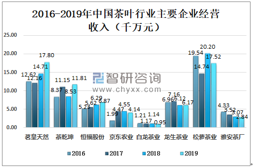 2016-2019年中国茶叶行业主要企业经营收入(千万元)