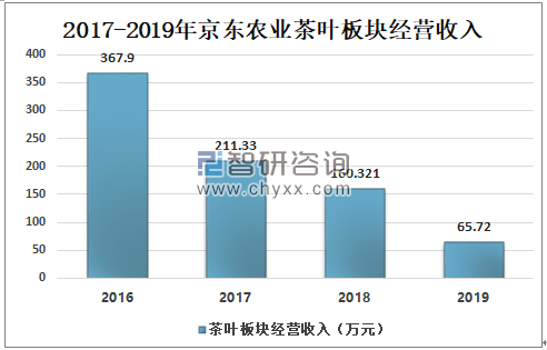 京东农业茶叶板块经营收入也呈下降走势,2016年京东农业茶叶板块经营收入为367.9万元,2019年茶叶板块经营收入为65.72万元。