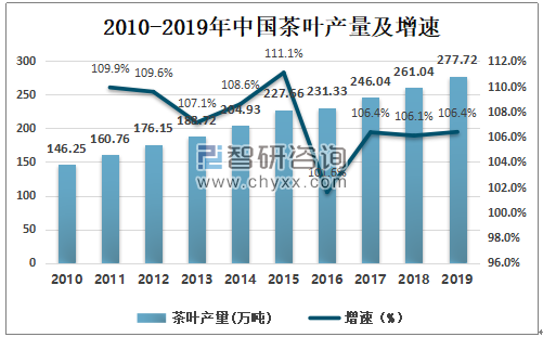 茶起源于中国,盛行于世界。中国是生产茶叶大国,2018年中国茶叶产量为261.04万吨,2019年中国茶叶产量为277.72万吨,较2018年增加了16.68万吨,同比增长106.4%。