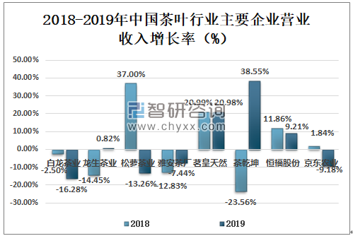 2018-2019年中国茶叶行业主要企业营业收入增长率(%)