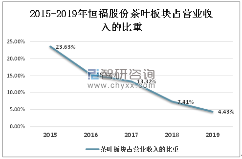 恒福股份茶叶板块占营业收入的比重也逐渐下降,2015年茶叶板块占营业收入的比重为23.63%,2019年占比下降至4.43%,2015-2019年茶叶板块占营业收入的比重下降了19.2%。