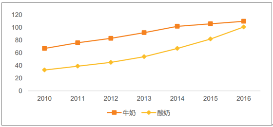 随着收入改善,对健康的追求,以及受一部分人乳糖不耐症的影响,酸奶替代白奶的趋势不断明显。近年来,酸奶在液态奶中的占比正不断提升,到 2016 年与牛奶的销售额持平,预计未来白奶的市场份额会更多的被酸奶替代掉。