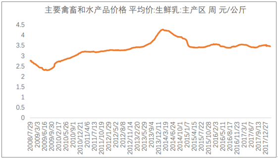 我国生鲜乳价格在波动中整体呈上升趋势,在此期间受各类事件以及供需关系变化而呈现波动。因此,自 06 年以来的生鲜乳价格,整体呈现周期特点。第一个周期在 2006 年至 2008年,这一阶段是我国乳业快速发展的阶段,消费量的剧增导致生鲜乳需求增加促使价格上涨,然而 08 年三聚氰胺事件使得消费者信心急剧下降,消费量减少,奶价下跌;第二个周期在 09 年到 12 年,这一阶段我国乳制品行业开始回复重建,渐渐走出低迷,消费者对乳制品消费增加,但由于供给的不断增加,奶价在 11 年中有所下降。第三个周期是 12 年 到 16 年,自 2014 年最高点 4.27 元来,因生鲜乳供应过剩而价格下跌, 2015 年以来,价格下跌趋势进一步加剧,进入奶剩周期。