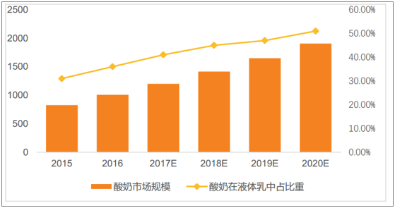 可以看出,酸奶的增幅要远远大于牛奶的增幅。 2010 年看酸奶的销售额为 330 亿,是牛奶的一半,而到 2016 年看,酸奶的销售额已超过 1000 亿,酸奶在液态乳中的比重逐年增加。,到 2020 年,酸奶的销售额预计能达近 2000 亿,在液态奶中的占比也将进一步提升。