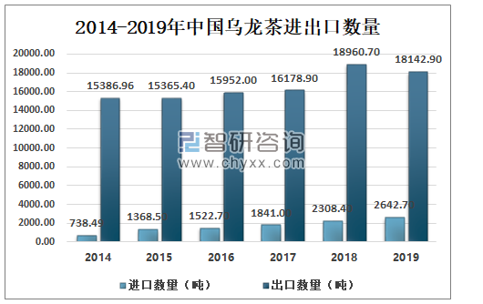 中国作为主要生产茶叶且有着悠久茶叶历史的国家,乌龙茶的出口量远大于进口量。2019年中国出口量为18142.9吨,较2018年减少了817.8吨。而中国乌龙茶的进口量逐年增加,2019年中国乌龙茶进口量为2642.7吨,较2018年增加了334.3吨。
